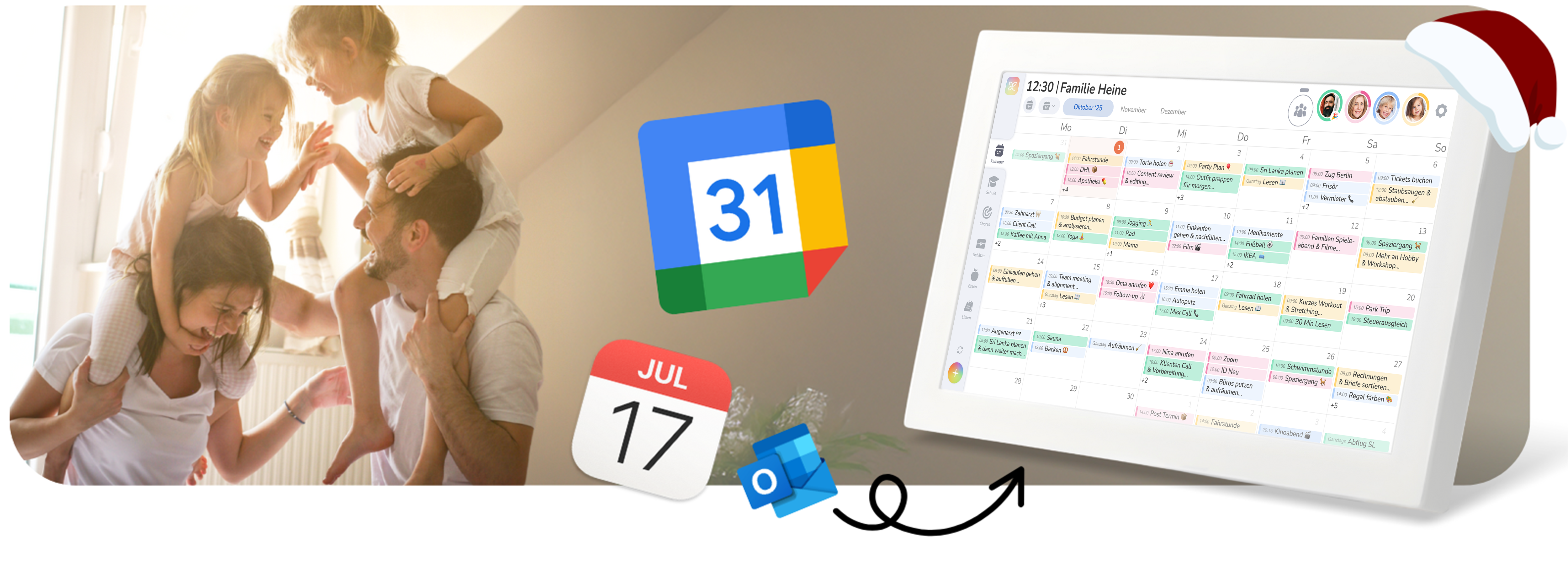 Termine direkt am Gerät hinzufügen oder in nur 5 Minuten die Online Kalender (Google, Apple, Outlook, ...) aller Familienmitglieder verbinden – und Termine werden in Echtzeit, für alle sichtbar synchronisiert.